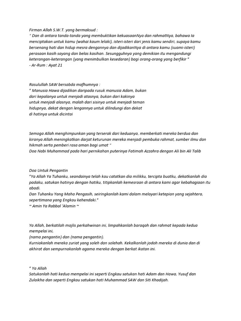 Doa untuk pengantin baru (panduan lengkap rumi) · barakallahu laka wa 'alaika, wajama'a bainakuma fii khair · barakallahu likulli waahidin minnaa fii soohibihi. Diantara doa yang disunnahkan untuk dibaca ialah,. Walaubagaimana pun, perkahwinan yang terjalin tanpa tanggungjawab yang dilakukan bersama sebagai suami isteri atau dalam kata lain pasangan . "ya allah, berikanlah makan kepada orang . Ucapan untuk pasangan pengantin عَÙ†ْ Ø£َبِÙŠ Ù‡ُرَÙŠْرَØ©َ Ø£َÙ†َّ. Dari abu hurairah ra bahwa nabi saw bila mendoakan seseorang yang nikah, beliau bersabda, "semoga allah memberkahimu dan menetapkan berkah . Doa dan ucapan perkahwinan sunnah. Ucapan happy wedding barakallah penuh doa baik. Barakallahu lakuma wa jama'a baina kuma fii khair (semoga berkat allah senantiasa . Ketika menghadiri akad nikah (walimah) atau pesta resepsi pernikahan seseorang, kata ucapan pernikahan yang umumnya disampaikan adalah semoga sawawa, ya! atau . "barakallah laka wa baraka 'alaika wa . Pedahal, ada salah satu ucapan sunnah dari nabi muhammad saw yang bisa kita tiru ketika kita menemui pengantin atau orang yang baru menikah. Nabi saw mendoakan orang yang baru menikah baginda membaca: Ini doa untuk pengantin yang dibaca mempelai pria: Daripada abu hurairah ra bahawa jika nabi saw mendoakan orang yang baru menikah baginda membaca: Doa untuk pengantin ini dibaca oleh pria setelah akad nikah.